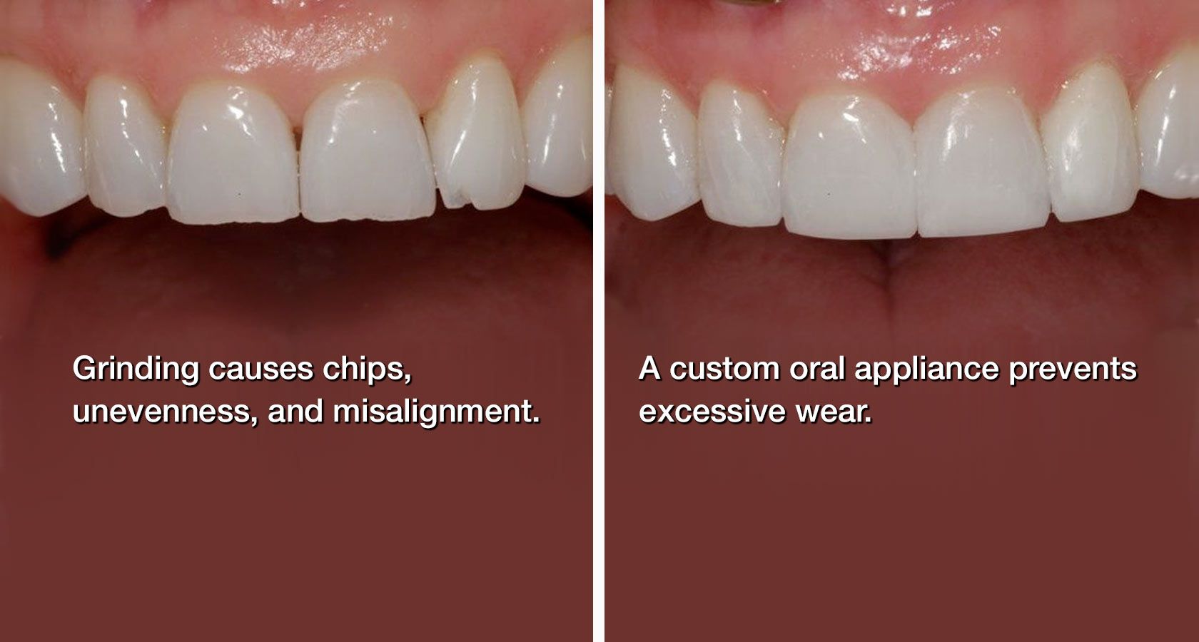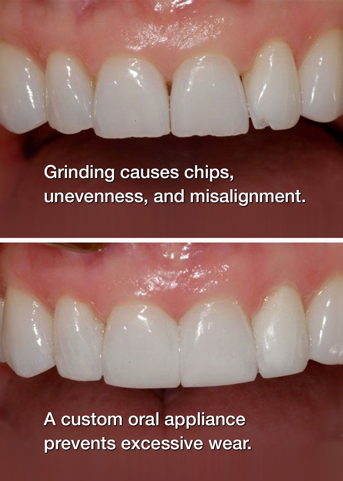 An oral appliance helps to evenly distribute bite force when you grind your teeth and prevent excessive wear on your teeth.
